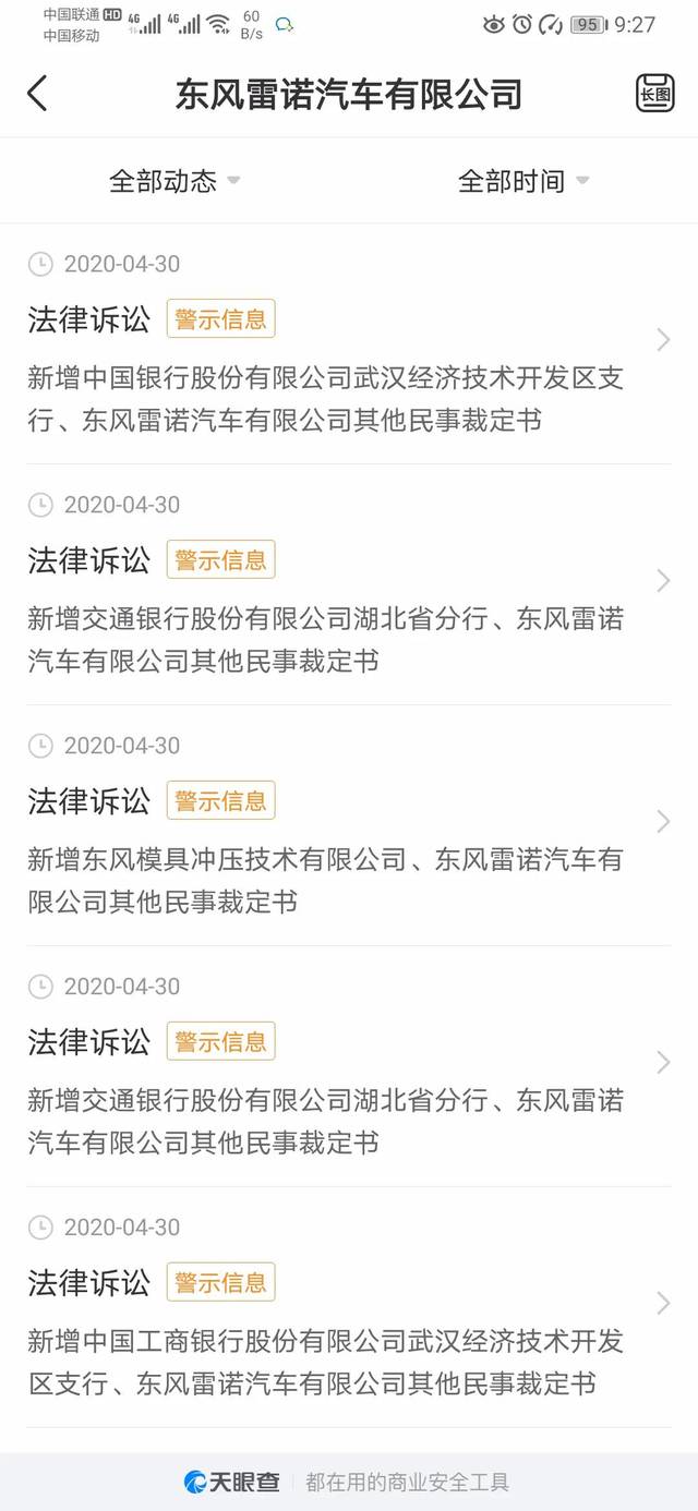 此外, 4月30日,东风雷诺还新增6条法院查封信息,其中5条是中国银行、交通银行、工商银行以及浦发银行申请法院查封东风雷诺汽车有限公司位于武汉经济技术开发区黄金口产业园的土地使用权的裁定书,1条是东风模具公司申请法院查封东风雷诺汽车有限公司位于武汉经济技术开发区黄金口产业园的土地使用权的裁定书。上述裁定保全标的价值累计16.14亿。