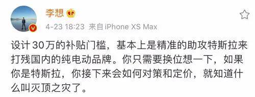 “设计30 万的补贴门槛,基本上市精准的助攻特斯拉来打残国内的纯电动品牌。你只需要换位想一下,如果你是特斯拉,你接下来会如何对策和定价,就知道什么叫灭顶之灾了。”李想指出。